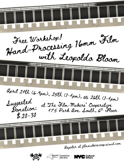 On April 24th from 6-9pm, April 25th from 1-4pm, or April 26th from 1-4pm, visit The Film-Makers' Cooperative (475 Park Avenue South, 6th Floor) to participate in this free 16mm film hand-processing workshop, open to all regardless of experience level and hosted by filmmaker and longtime Coop member Leopoldo Bloom.