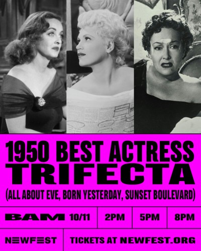 On OCTOBER 11th from 2pm-8pm at BAM Rose Cinemas, NEWFEST celebrates the show-stopping performances of Hollywood legends Bette Davis, Gloria Swanson, and Judy Holliday in ALL ABOUT EVE, SUNSET BOULEVARD, and BORN YESTERDAY, respectively. This tantalizing triple feature is your chance to relive one of the most iconic Academy Award for Best Actress races on its 75th anniversary, when Holliday won in an upset over the heavily favored Swanson and Davis. Whether you’re team Gloria, team Bette, or team Judy (or even team Anne Baxter; sorry-not-sorry, Eleanor Parker), this tantalizing triple feature is your chance to relive the Oscar showdown that film lovers still obsess over.